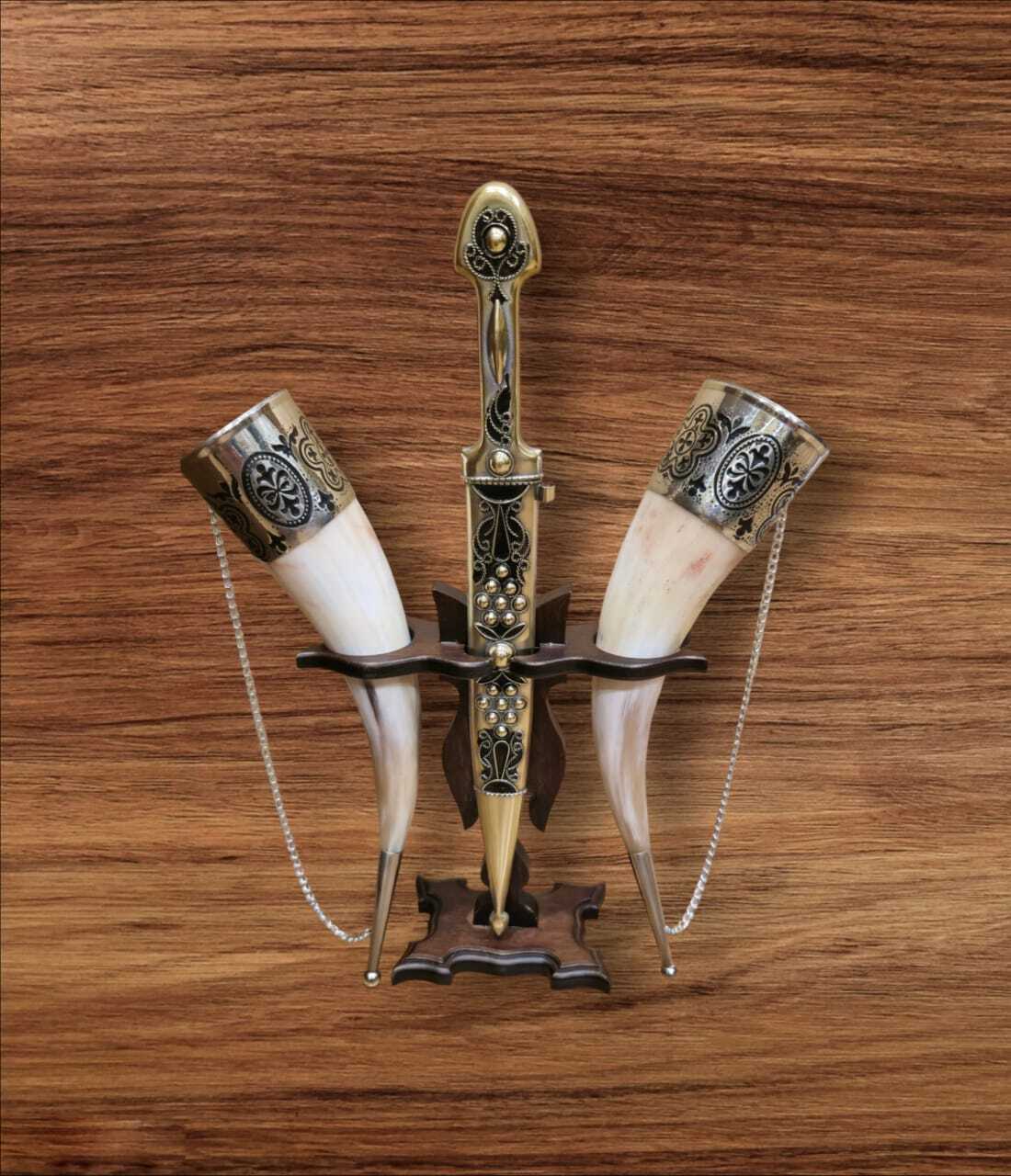 Подарочный набор настольный, кинжал, два рога комплект Этот подарочный набор станет великолепным украшением любого стола! Искусно выполненный миниатюрный кинжал и пара изящных рогов создадут атмосферу тепла и уюта, подчеркнут отличный вкус владельца. Прекрасное решение как для подарка деловому партнеру, так и близкому человеку. Импортируйте уникальность и стиль в повседневную жизнь с этим изысканным набором!